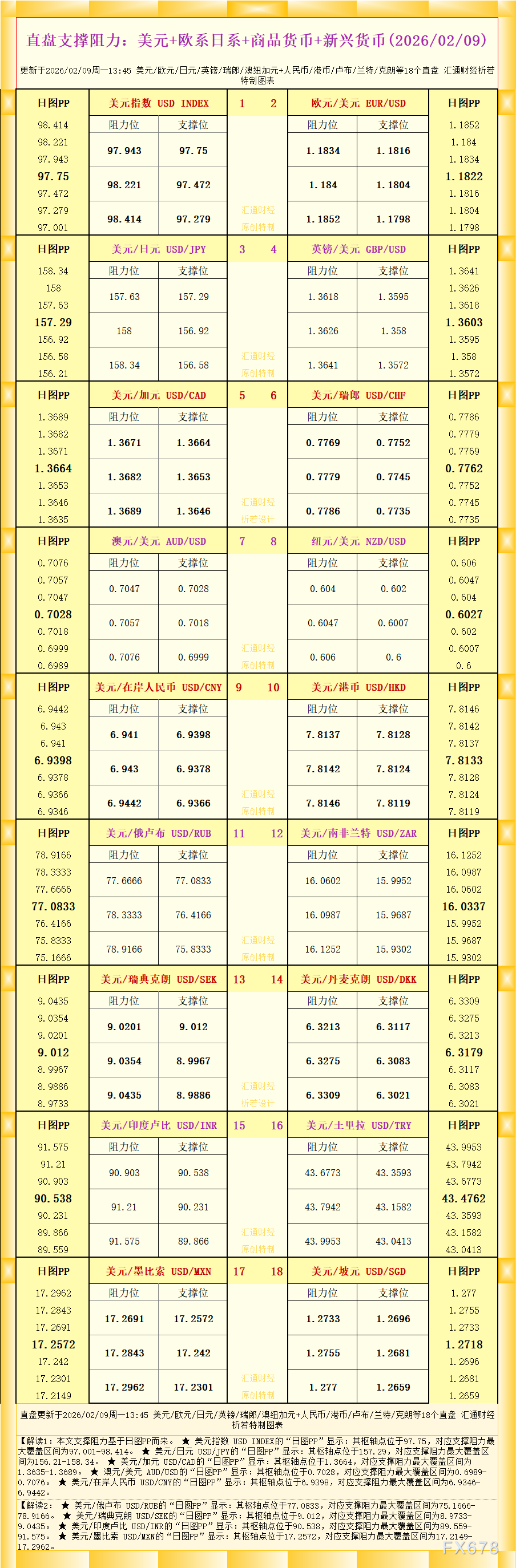 ex平台官网:一张图看18个直盘外汇支撑阻力:美元+欧系日系+商品货币+新兴货币(2026年2月9日)